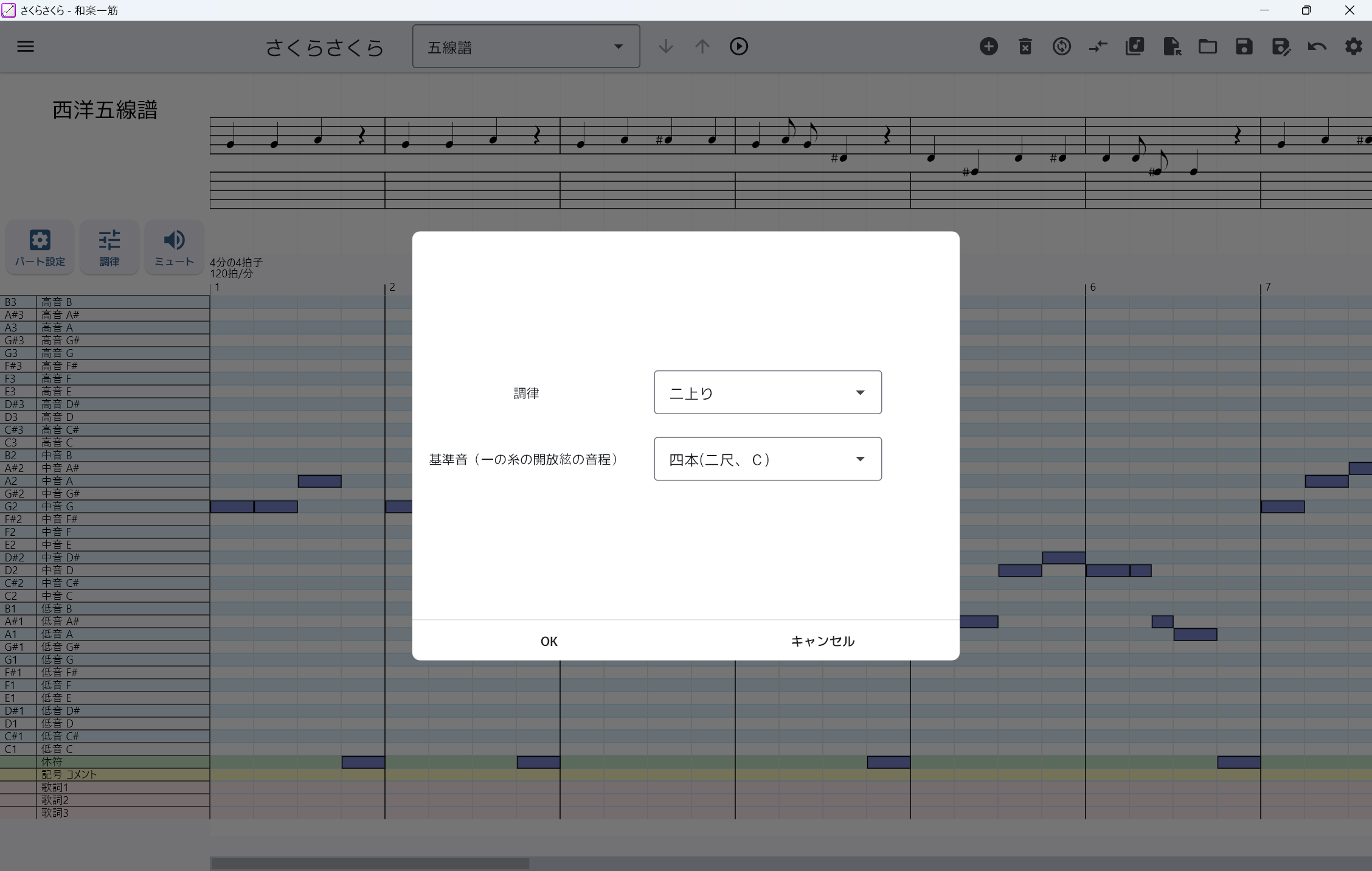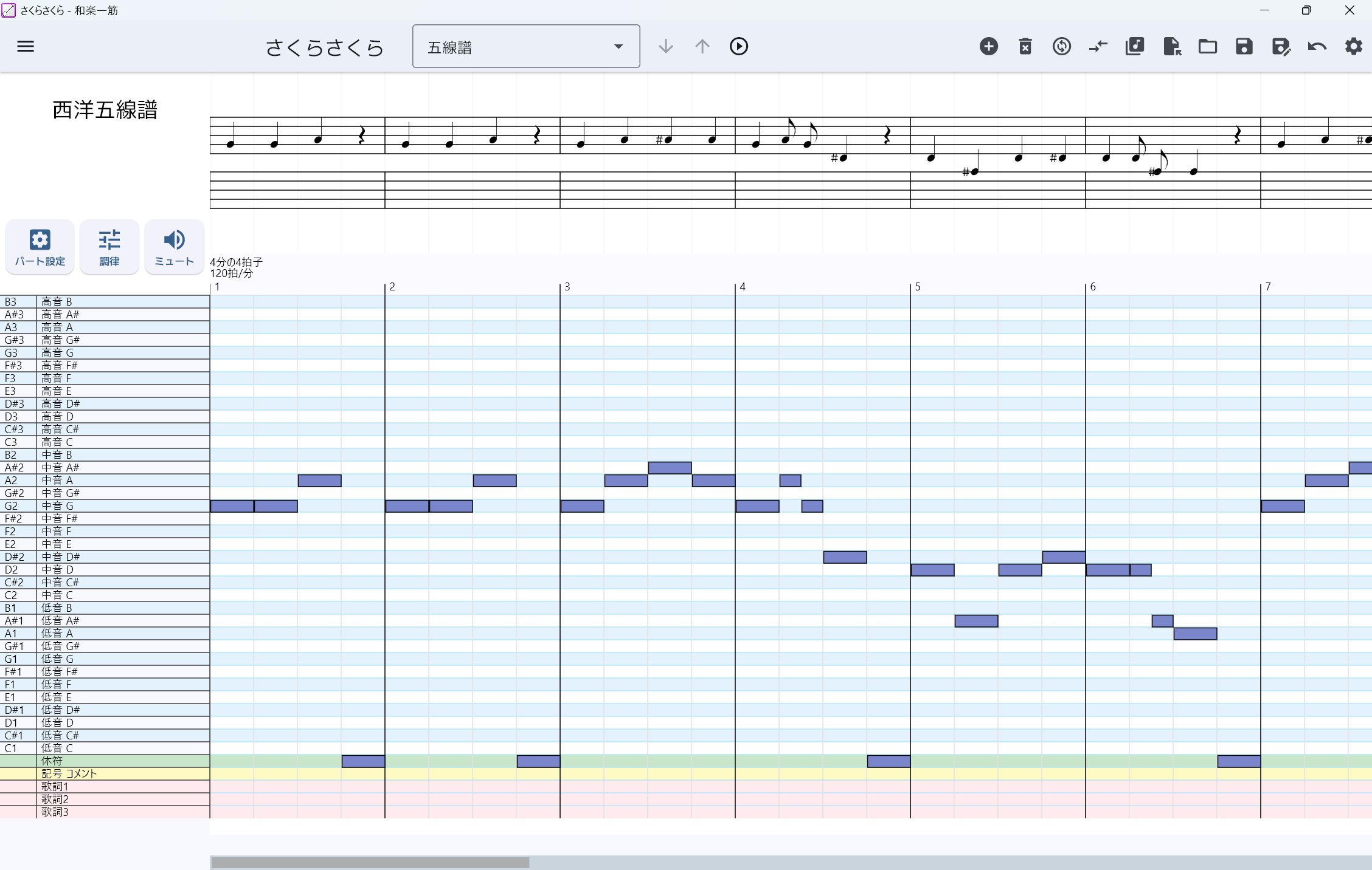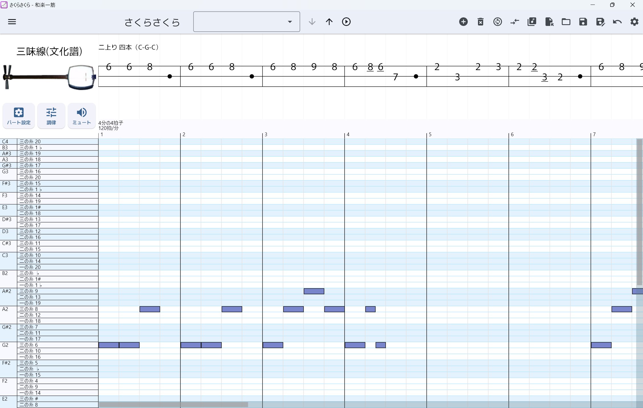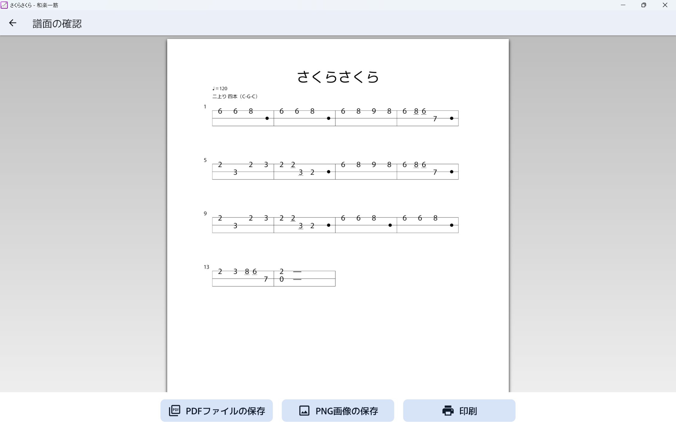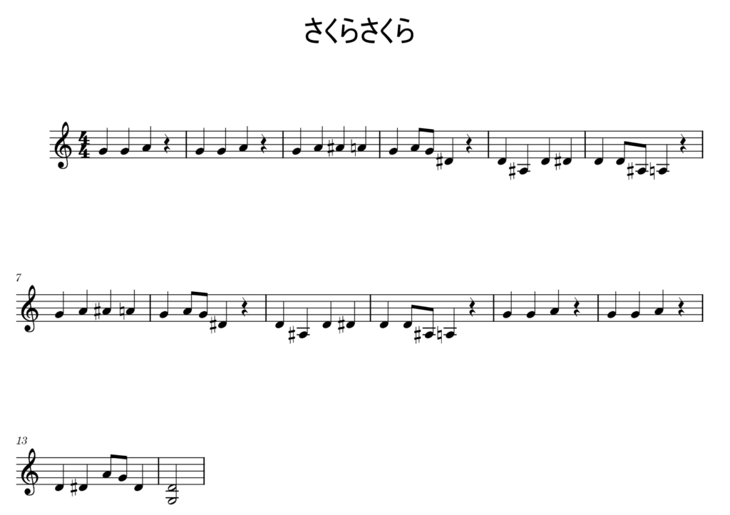 この記事では、例としてさくらさくらの五線譜から和楽器譜を作ってみます。