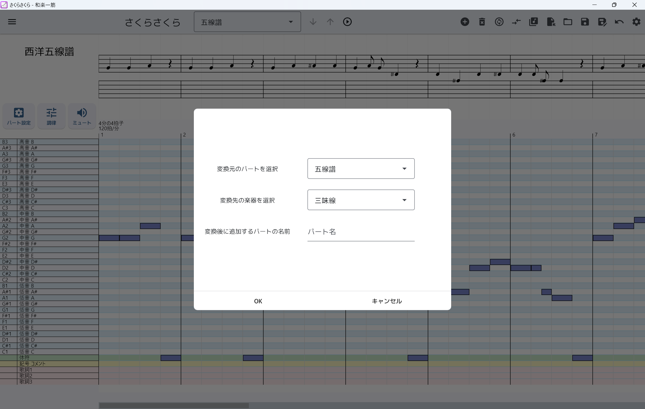 - 変換元のパートと、変換先の楽器を選びます。