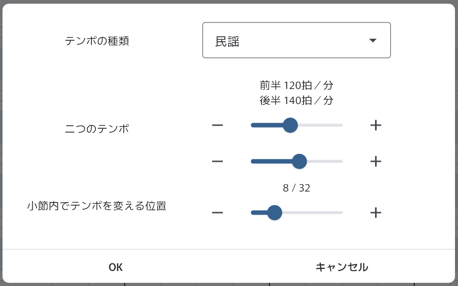 一つの小節内における、前半と後半のテンポと、小節内でテンポが変わる位置を設定します。