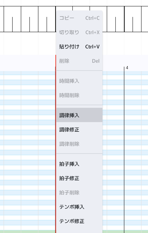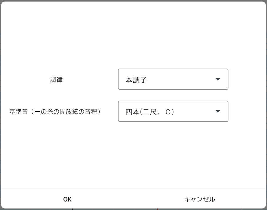調律を設定する手順について解説します。 ピアノロール画面の適当な場所で右クリックします。「調律修正」を選択します。設定画面が表示されます。必要な項目を設定し、「OK」ボタンで設定できます。 曲途中の調弦変更 箏パートの場合は、曲の途中で調律を変更することができます。 調弦を変えたい位置で右クリックします。「調律挿入」を選択します。設定画面が表示されます。必要な項目を設定し、「OK」ボタンで設定できます。 和楽器楽譜作成・変換ソフト 和楽一筋 説明書このソフトについて 対応楽器と記譜法 尺八の記譜法(琴古流・都山流) 篠笛の記譜法(横書き数字譜) 三味線の記譜法(文化譜・家庭式譜・研精会譜・青柳譜) 箏・十七絃箏の記譜法(家庭式譜) 大正琴の記譜法(横書き数字譜) 沖縄三線の記譜法(工工四) 和太鼓の記譜法(西洋譜) 鳴物の記譜法(長唄手附) 琵琶の記譜法(薩摩琵琶弾法譜) 篳篥の記譜法(雅楽明治撰定譜) 龍笛の記譜法(雅楽明治撰定譜) 笙の記譜法(雅楽明治撰定譜) ソフトの使用方法 画面構成 音符の編集 調律の編集 拍子・テンポの編集 時間挿入・削除 繰り返し記号の編集 パートの編集 保存・読み込み・印刷 midi/musicXMLファイル保存・読み込み 西洋音階・和楽器譜変換 有料プランの登録・変更・解約 その他 著作権 商用利用 参考文献 FacebooktwitterHatenaPocket