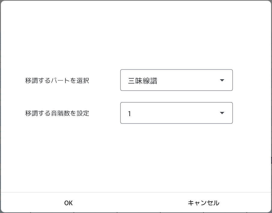 調律の変更(例:本調子→二上り等)をしたい場合は、この機能ではなく、和楽器譜変換機能により別パートに変換することで、キー操作と調律の変更が同時にできます。